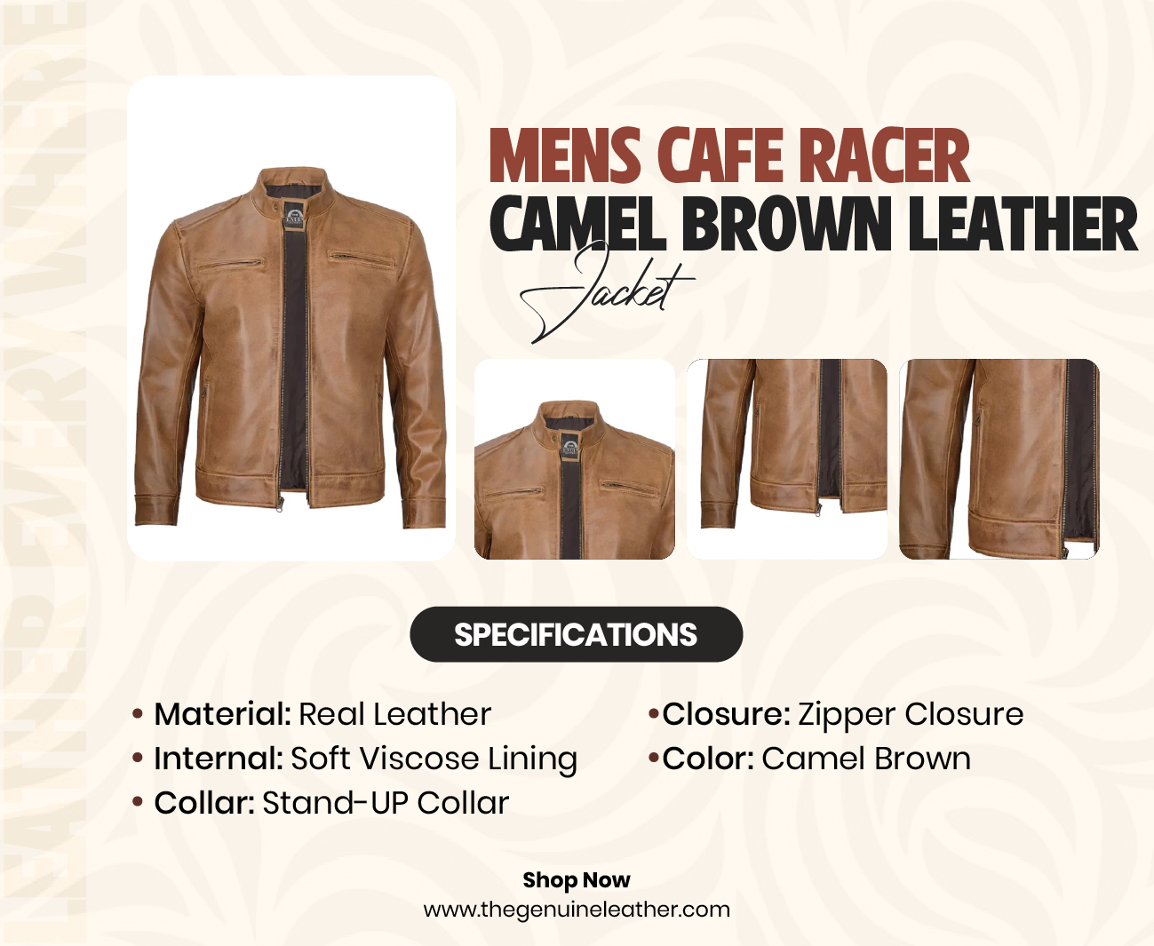 We at The Genuine Leather focus exclusively on genuine leather clothing with high quality and a vintage touch, coupled with sleek modern styling. All our jackets, including the Men’s Camel Brown Cafe Racer Leather Jacket featured here, are submitted to rigorous quality inspections in order to achieve a perfect fit, great comfort, and durable wear. We purchase only leather produced using sustainable and ethical means and value sustainability while maintaining style.We carefully design the buying experience to be completely hassle-free—from browsing to delivery—focusing on making every customer a valued partner around the world.