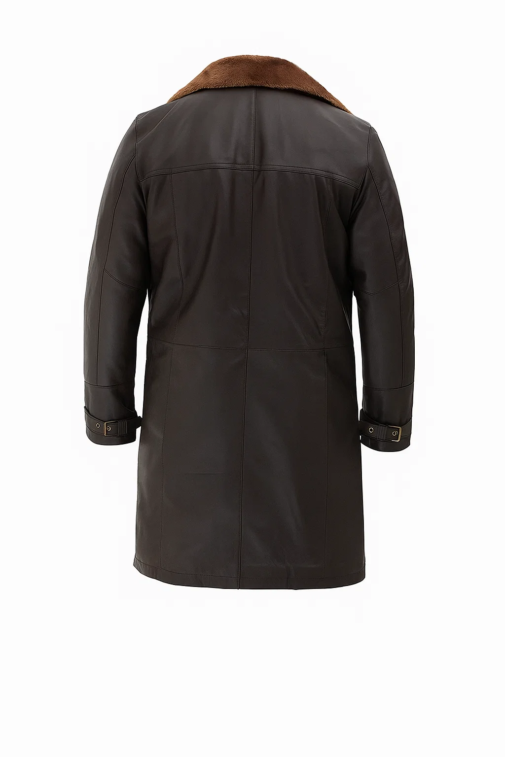 The Mens 3/4 Length Dark Brown Leather Shearling Coat is designed to provide extra coverage while elegantly elongating the silhouette for a sophisticated look.