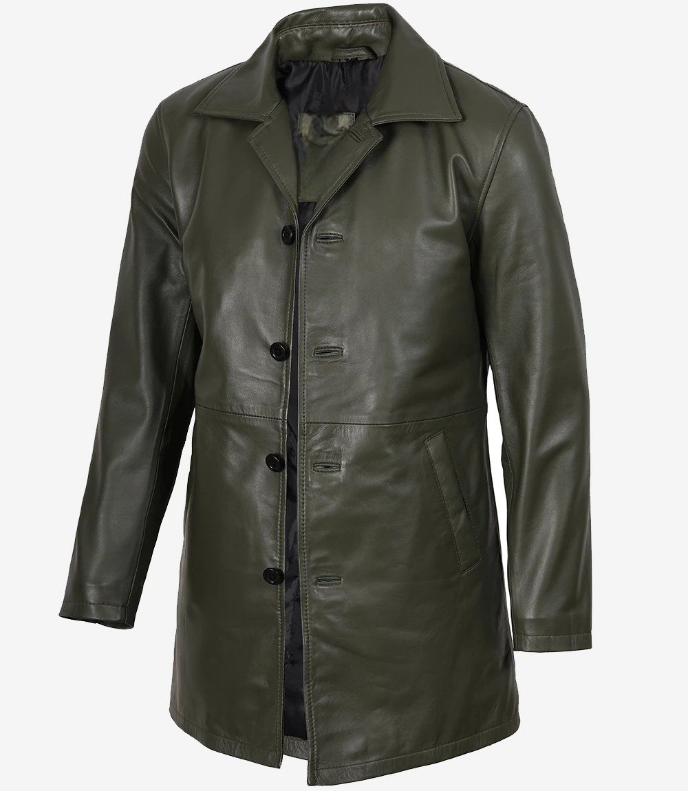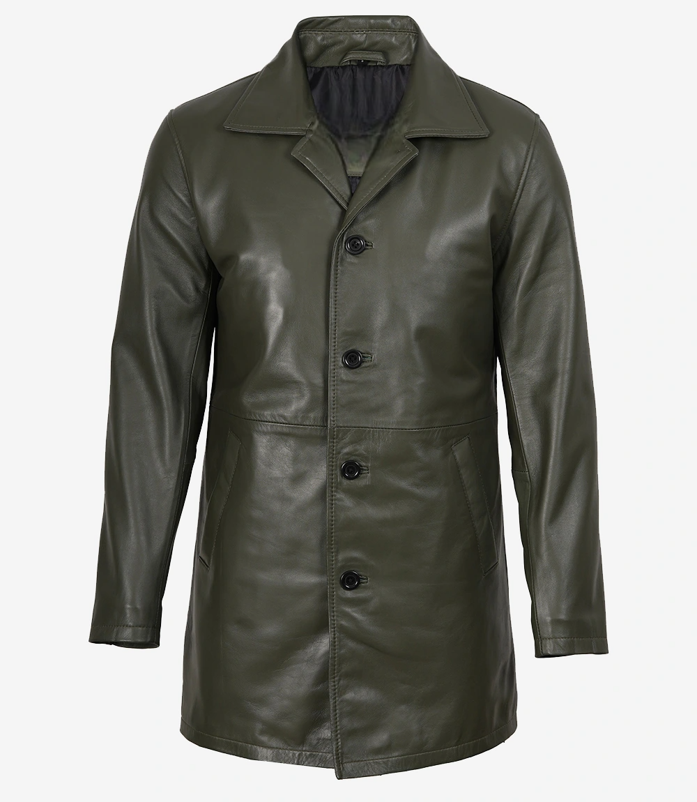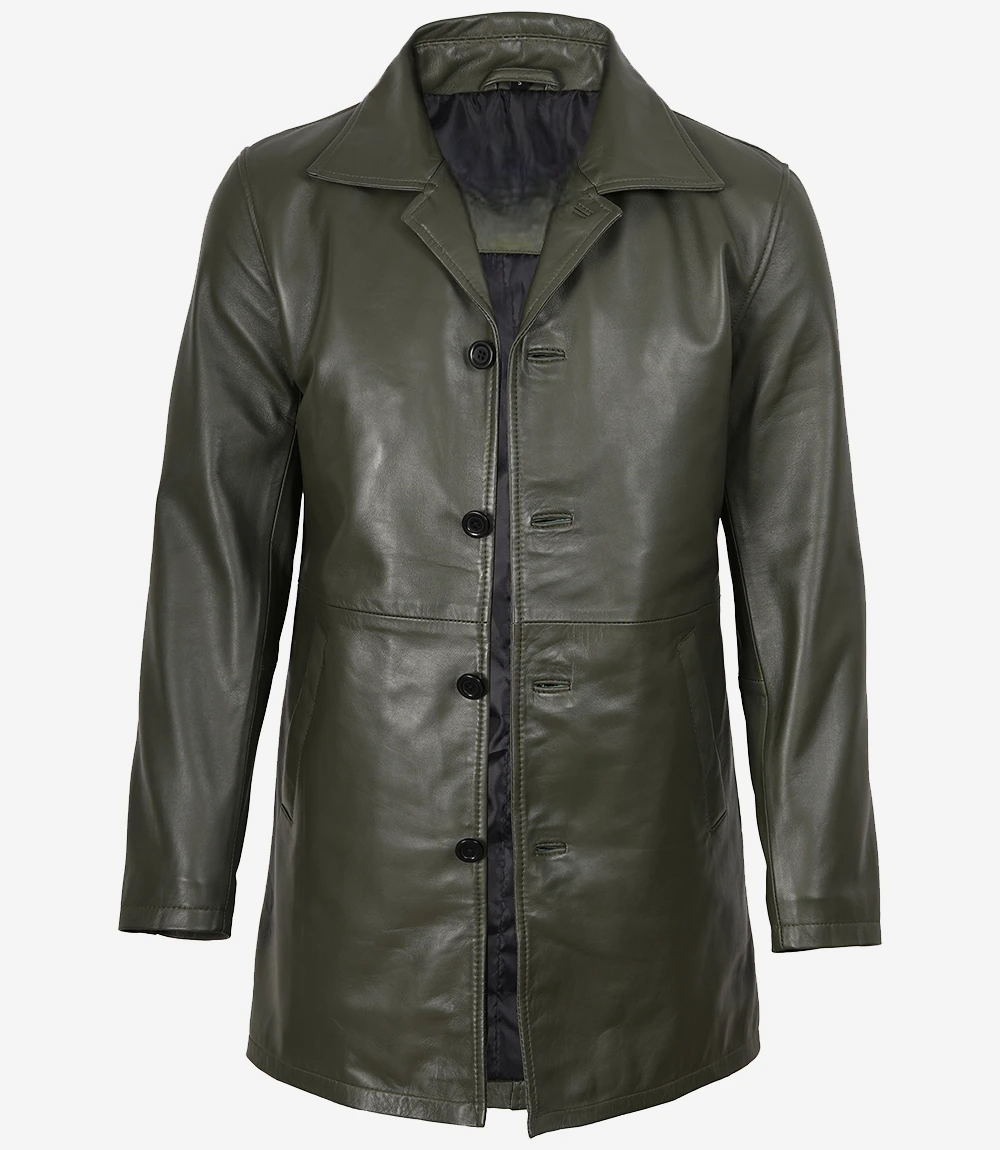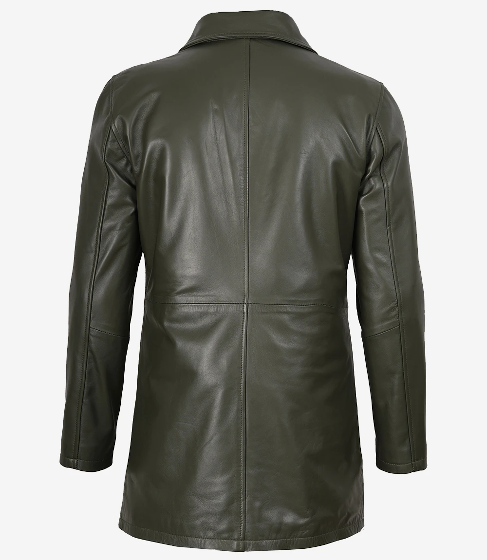 Men’s Olive Green 3/4 Length Leather Car Coat