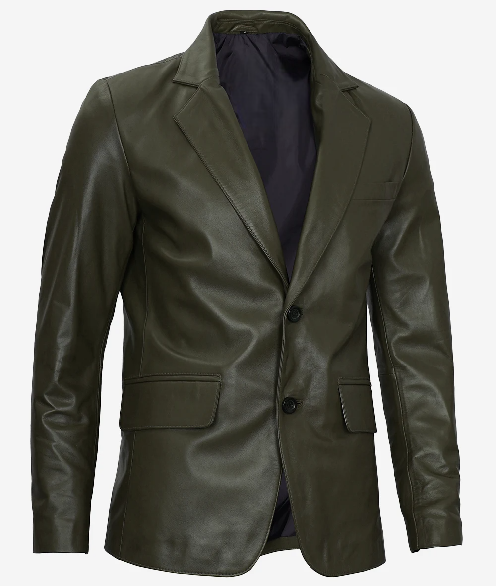 Mens Olive Green Two-Button Leather Blazer