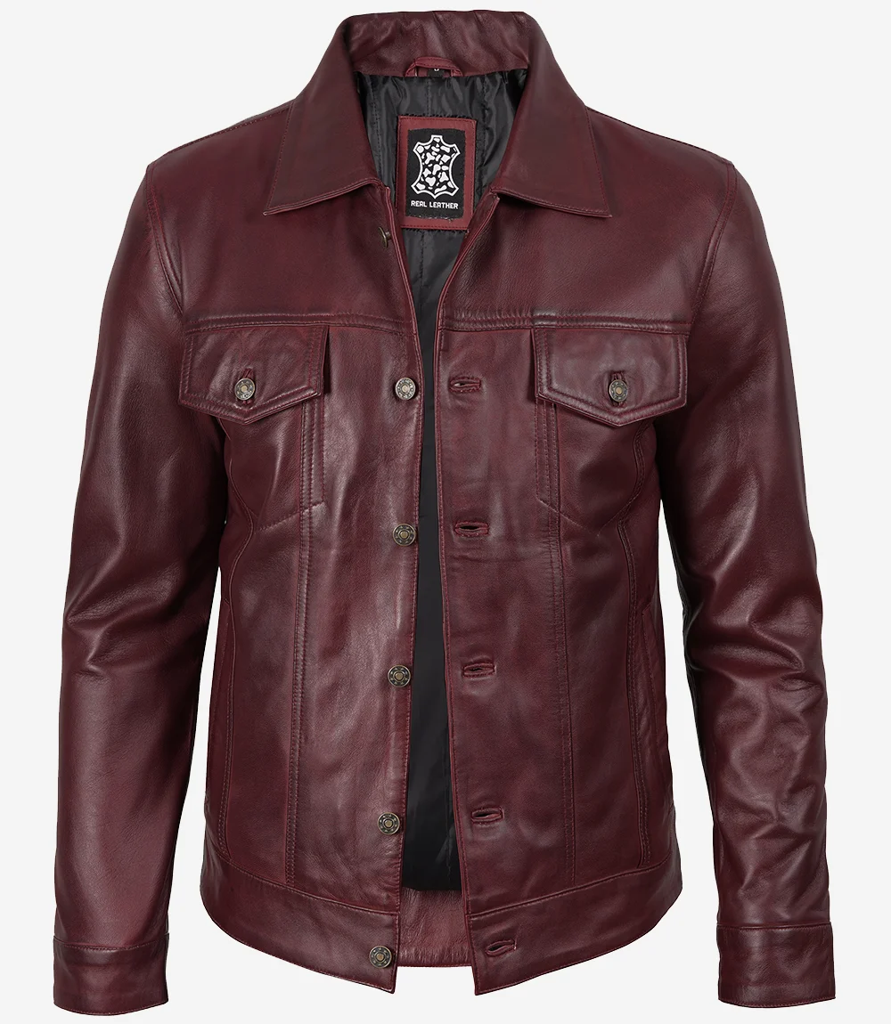 Men’s Real Lambskin Leather Burgundy Trucker Jacket