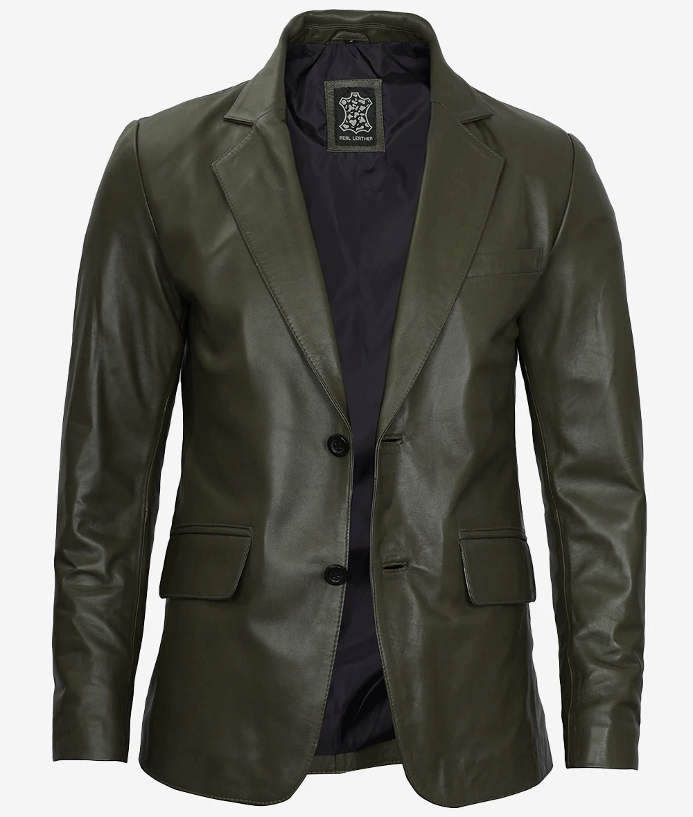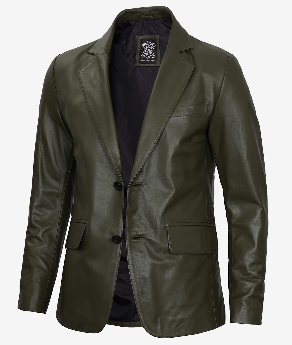 Mens Two Button Olive Green Leather Blazer