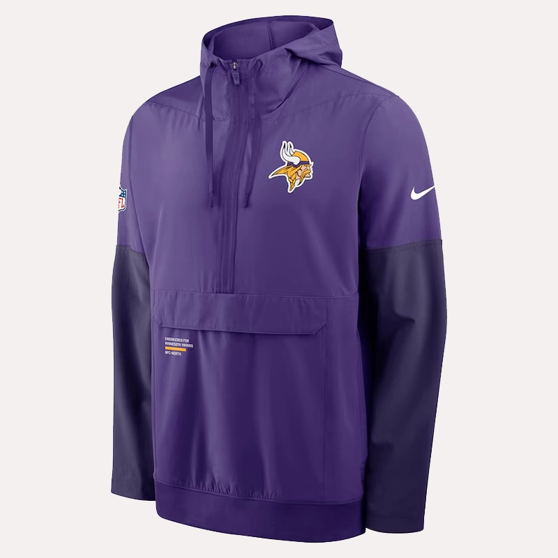 The Genuine leather, in search of marvelous finds that you would adore, chooses only the best. The collection is meant for you to treasure because these were not things meant to last through generations, but rather create long memories with them. And yes, you get something terrific every time. This time, bringing to you the super fantastic Vikings Nike Sideline Anorak Hoodie Jacket. This jacket looks so cool and feels really good. It’s for game day, casual wear, or just showing your team spirit.