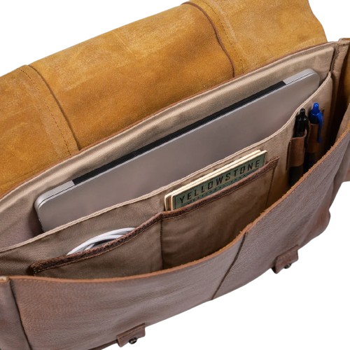 This leather messenger bag feels soft and sturdy the style looks great and it carries all my essentials perfectly so I am very happy with this purchase.