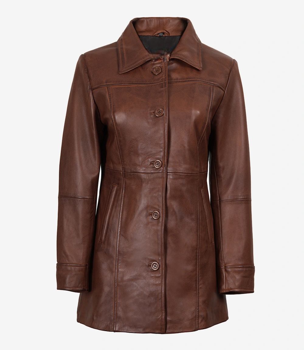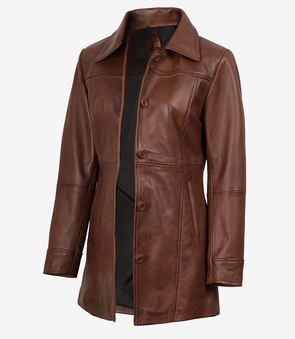 Womens 3/4 Length Button Down Leather Coat