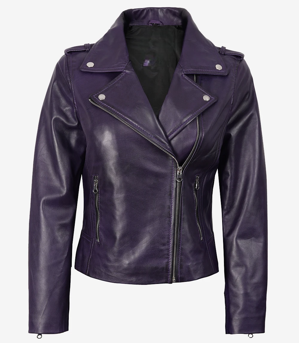Women’s Asymmetrical Lambskin Purple Biker Style Jacket designed for a very close fit that renders the body better-shaped and the body movement still unobstructed.