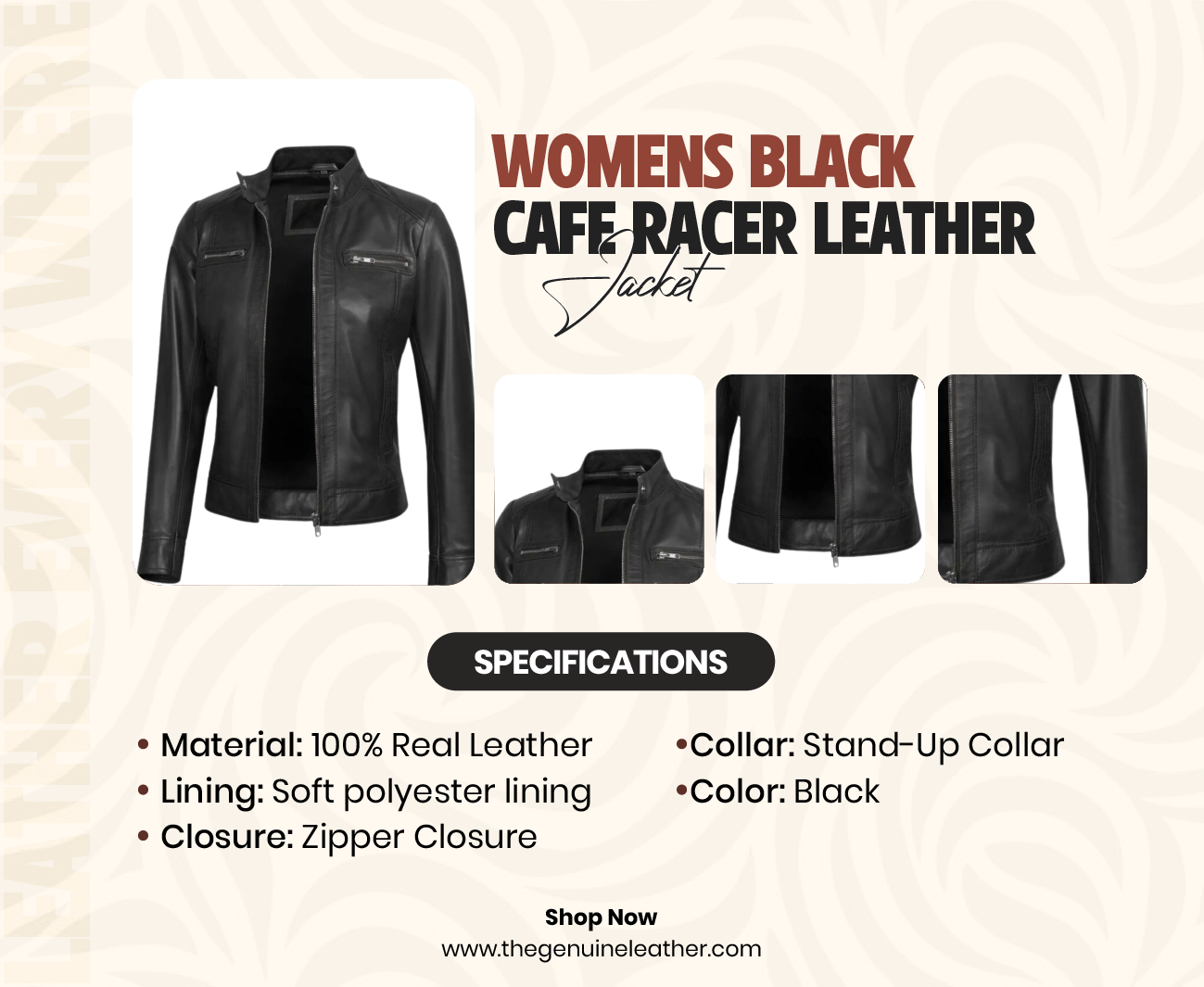 We at The Genuine Leather understand what it takes to blend sophistication with edge, and this jacket perfectly embodies it. A minimalist cafe racer cut, it reflects our commitment to streamlined lines, figure-flattering fit, and premium materials. A focus on each zipper and detail delivers a sleek, powerful aesthetic. This cafe racer leather jacket isn’t just an article of outerwear — it’s an extension of our broader mission to provide authentic, stylish leatherwear to women who demand both functionality and fashion. Take a look at our entire collection of outerwear to understand how this piece integrates into your life.