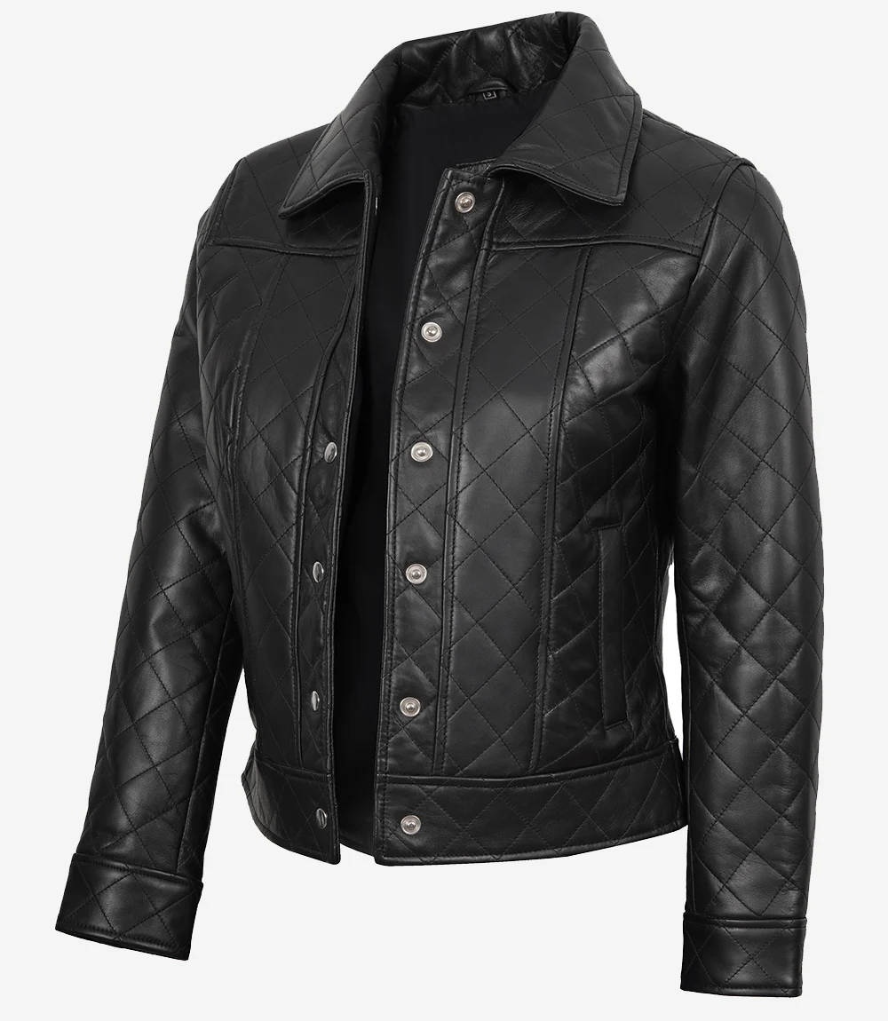 Womens Black Quilted Leather Jacket Harrington Style