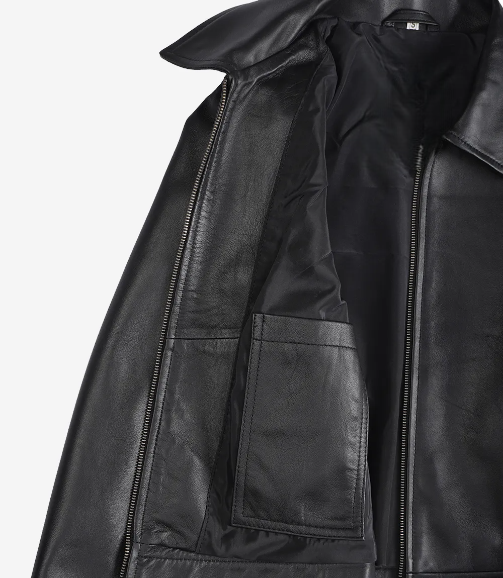 Womens Black Shirt Collar Harrington Leather Jacket