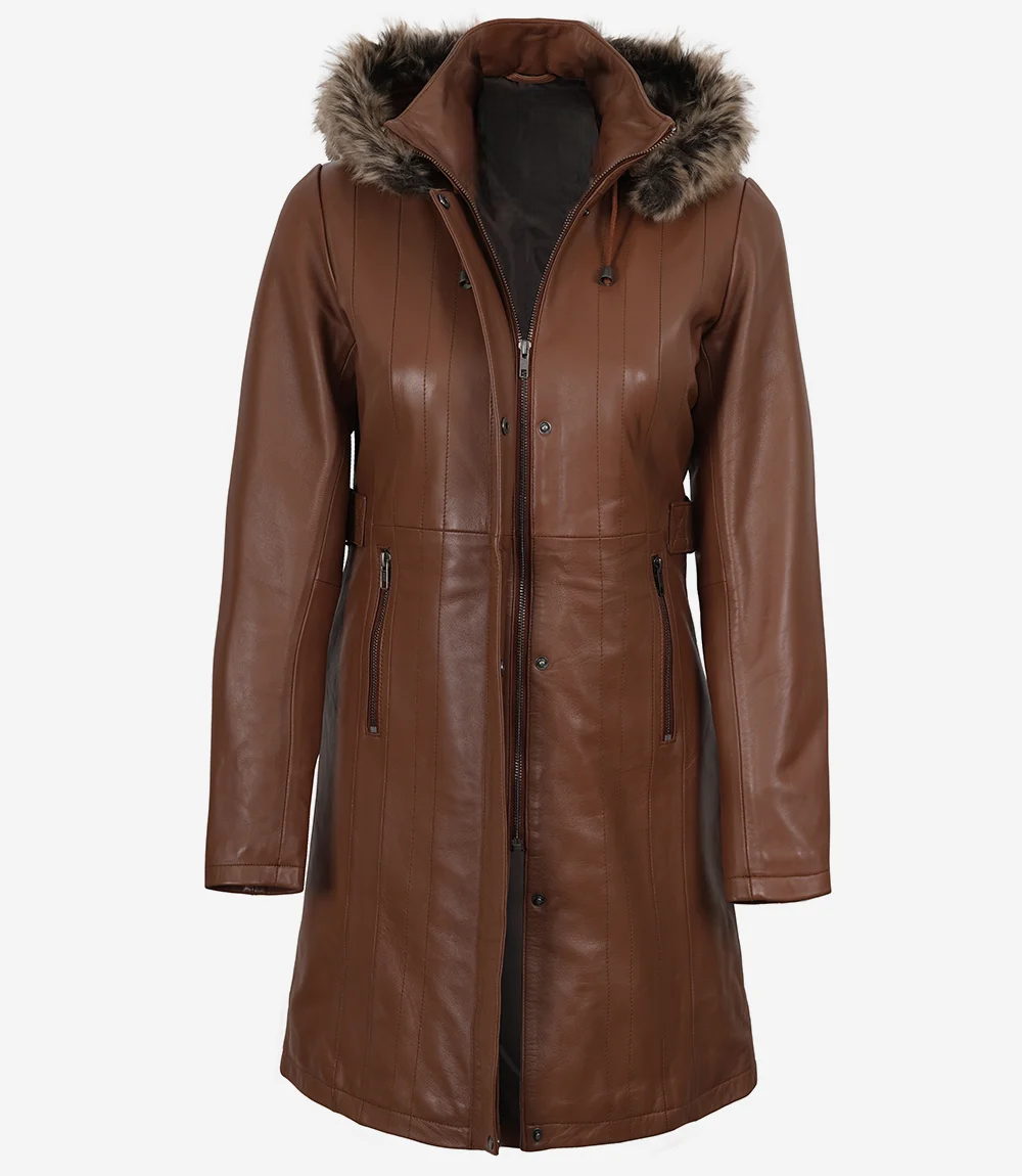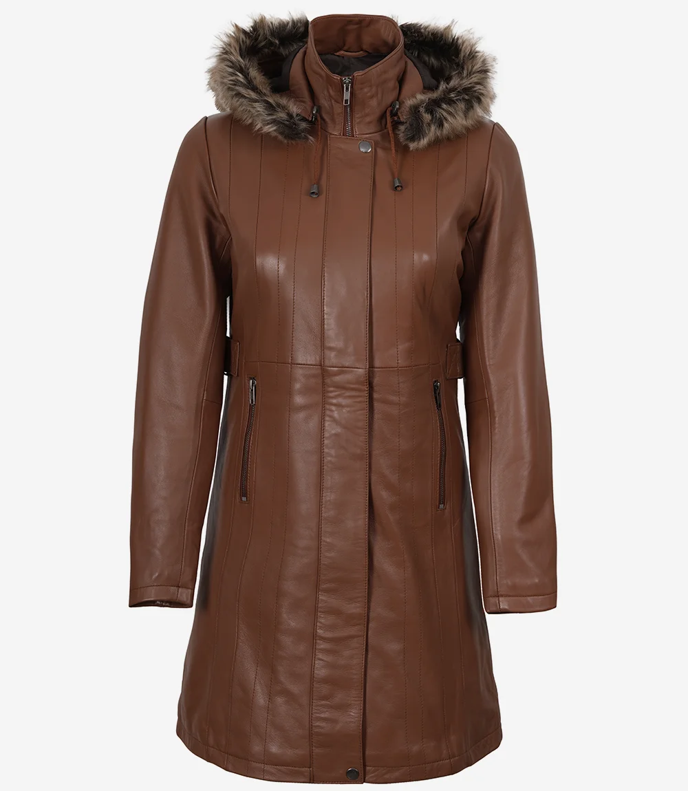 Women’s Brown Real Leather Coat With Removable Hood